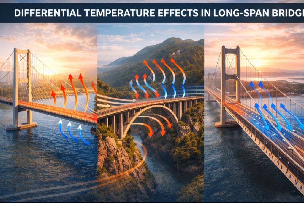 Differential temperature effects are silent but powerful forces in long-span bridges. Unlike traffic load, temperature acts every day and affects the entire structure.