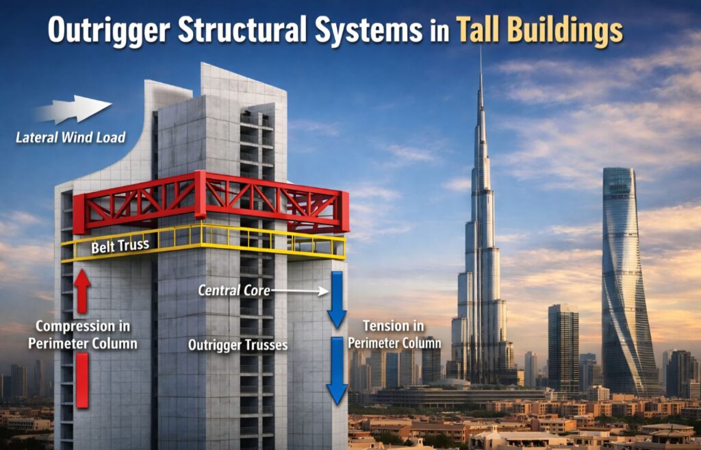 Outrigger structural systems represent a key innovation in the design of tall buildings. By linking the core to perimeter columns, they transform structural behaviour, reduce bending stresses in the core, enhance lateral stiffness, and improve overall structural efficiency.